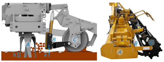 On the left schematic view and on the right a picture of the implemented harrowing machine, with indication of the working depth h of the rotary tines (A) and of the height k of the levelling bar (B) closing the back part of the working volume; Soil is eventually levelled by a couple of cage rollers (C).