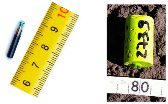 A RFID package from Oregon RFID Co., Portland, OR, USA was implemented in this work. This package consists of RFID reader and passive tags. Tags are in a cylindrical shape with 3.65 mm diameter and 23 mm length. Being small in dimensions and weight (less than 1 gram) allows their integration into bigger envelopes. In fact, in order to simulate topsoil components such as crop residues and soil clods, a cork stopper was drilled laterally and one RFID tag inserted inside each stopper then closed by glue. Cork stoppers were chosen, due to their wide availability, durability, and high similarity (in terms of shape, size, and density) specially with crop residues such as dry corn stems or corncob. Furthermore, they allow to damp the effects of rotary harrow tools, minimizing the eventuality of damages to the delicate RFID tags. Each tag (and thus each cork stopper) had an identification number which allowed individual monitoring. Additionally, cork trackers were painted with shining fluorescent color and tag identification number in order to facilitate recognition after the harrowing process (Figure 2).