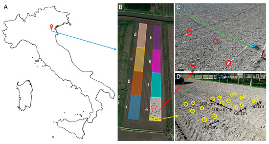 (A)—Geographical localization of the experimental site in Italy. (B)—Experimental area with representation of the experimental design. (C)—Some of the tags after tillage operation. (D)—Trackers distribution on undisturbed soil, before harrowing process.