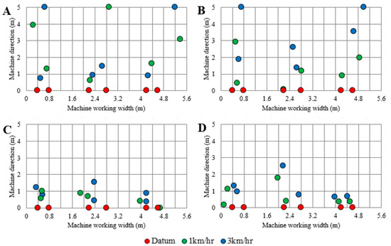 Average trackers movement at different rotary harrow working conditions where: (A) at level bar of zero and depth of 6 cm, (B) at level bar of zero and depth of 10 cm, (C) at level bar of 10 cm and depth of 6 cm, and (D) at level bar of 10 cm and depth of 10 cm.