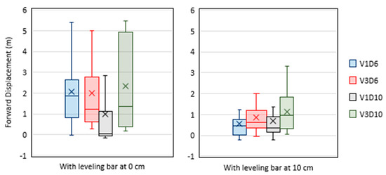 Average trackers forward movement at different working conditions where V1 and V3 refer to forward speed of 1 and 3 km/h. Also, D6 and D10 refer to working depth of 0.06 and 0.1 m.