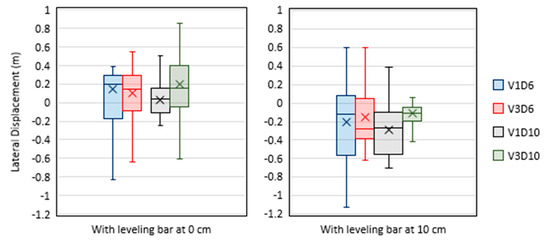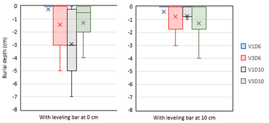 Shifts in lateral direction were limited to 0.03 m left on average, with a standard deviation as high as 0.40 m. This is in agreement with the rotary harrow symmetric construction, where clockwise and anticlockwise rotating tine pairs are alternated: such working mode allows avoidance of soil piling phenomena, as confirmed by RFID distribution. In this case, the levelling bar position plays only a marginal role statistically irrelevant: 0.12 m right lateral displacement in the case of bar at ground level and 0.20 m left shift in the case of lifted up position. A slightly different situation is highlighted in the case of analyses related to tags depth. In fact, lower position of the levelling bar caused an average increase on burial phenomenon from −0.8 cm to −1.5 cm on average. Such apparently low values (compared to the working depth) are most probably ascribable to some kind of floating phenomenon the cork stoppers underwent due to their density, sensibly lower than soil clods density, but comparable to crop residues one. Figure 6 and Figure 7, illustrates the lateral movement and burial depth at different rotary harrow working conditions.