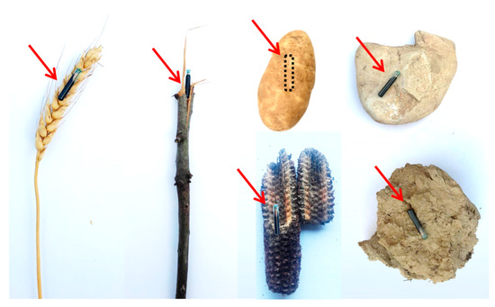 Besides characterization of the topsoil movement after the application of rotary harrow tillage operation, the proposed study demonstrates the effectiveness of the RFID technique soil movements monitoring operations. Differently, from metal or polymer trackers, RFID allows minimization of tags dimensions, allowing univocal identification and maximizing localization process both in terms of high detection percentage (close to 100%, and lower in case of harsh operation possibly affecting RFID tags integrity) and low detection time (a few seconds per tag). Additionally, it is also worth noting how the RFID approach can be in principle applied in order to simulate different materials in similar trials. The very tiny shape of RFID tags offers a wide range of simulations such as soil clods, stones, and crop residues of different shapes and densities. The best simulation for any studied object is the object itself where the material properties, such as density, surface roughness, and shape, will simulate and act naturally. Figure 8 illustrates the possibility of integrating the RFID tags in wheat spikes, straw, corn residues, potato, soil clods, or even small rocks for suggested future applications. In addition, it is worth mentioning that the easy recognition of RFID by the antenna and the unique ID for each tag will reduce the source of error and limitations in open field experiments, which will also lead to more reliable and understandable results.