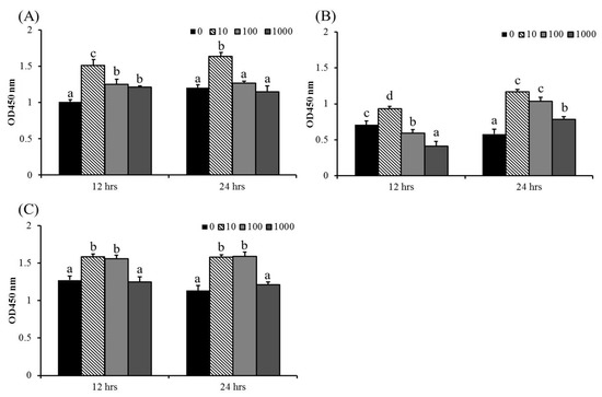 Hepatic (A) and splenic (B) macrophages and THK cell line (C) were treated with L-15 containing 0, 10, 100, or 1000 μg/mL of Agaricus blazei spent substrate extract (ABSSE). After 12 and 24 h of treatment, a Cell Counting Kit-8 (CCK-8) was used for evaluating cell viability. The optical density (OD) values are shown as mean + standard error of the mean. Significant differences (p < 0.05, one-way ANOVA, and Tukey’s post hoc test) are indicated by different letters.