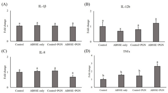 Gene expression analysis of Agaricus blazei spent substrate extract (ABSSE)-primed THK cells after stimulation with peptidoglycan (PGN). The THK cell line was primed with 0 (control) or 10 μg/mL of Agaricus blazei spent substrate extract (group ABSSE only) for 24 h and subjected to gene expression analysis. Additionally, THK cells were pre-treated with L-15 medium or medium containing ABSSE and then stimulated with 50 μg/mL PGN for 24 h. The former group was named “control + PGN” and the later “ABSSE + PGN”. Transcript levels of (A) IL-1β, (B) IL-12b, (C) IL-8, and (D) TNF-α were analyzed by quantitative real-time PCR. The expression values are shown as means + standard errors of the mean fold change relative to the control group. Significant differences (p < 0.05, one-way ANOVA, and Tukey’s post hoc test) from the control group are indicated by different letters.