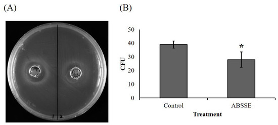 Agaricus blazei spent substrate extract (ABSSE) inhibits the growth of Streptococcus agalactiae. (A) The left and right wells of tryptone soy agar (TSA) that spread with Streptococcus agalactiae were inoculated with 100 μL of ABSSE (left, 50 mg/mL) or water extract of unfermented growth substrate (right, control) followed by a 24 h incubation at 28 °C. (B) Here, 100 μL of Streptococcus agalactiae (106 C.F.U./mL) in tryptone soy broth (TSB) was mixed with 900 μL of TSB with or without 50 mg/mL of ABSSE followed by a 2 h incubation at 28 °C. Then, 100 μL of mixture was spread on TSA and incubated 16 h at 28 °C. Colony counts from triplicate plates were recorded and data are shown as the means ± standard errors of the mean. Significant differences from the control group are denoted by asterisks (p < 0.05, paired-sample t-test). C.F.U. = colony forming unit.