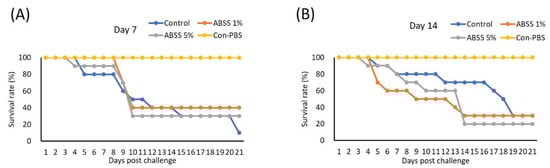 Fish were fed with feed containing 0 (control), 1%, or 5% Agaricus blazei spent substrate (ABSS) for (A) 7 and (B) 14 days and subjected to Streptococcus agalactiae infection. A control group that injected with phosphate-buffered saline (Con-PBS) was included. Survival percentages were recorded for 21 days. N = 10 per group.