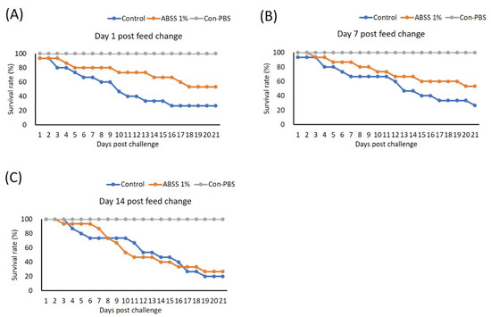 Fish were fed with feed containing 0 (control) and 1% Agaricus blazei spent substrate (ABSS) for 7 days, and the feed for the experimental group was then switched to the control feed and then fish were feed for (A) 1, (B) 7, and (C) 14 days prior to challenge with Streptococcus agalactiae. A control group that was injected with phosphate-buffered saline (PBS) was included (Con-PBS). Survival rates were recorded and calculated after 21 days of observation (N = 10 per group).