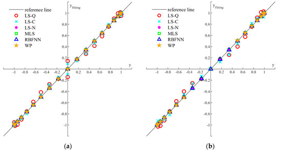 In order to compare the accuracy of the fitting methods, the y of the sample and the fitting results are shown in Figure 3, where the abscissa represents the of the sample and the ordinate denotes the fitted results . The vertical distance between the fitting results for y and the line is the error of the fitting, and when the point is located on the line , it means that the fitting result is accurate. Two types of fitting are performed: (1) Case 1, fitting for the sample data and (2) Case 2, fitting for the removed-sample data.