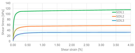 The soil is performed with a PressureIndependMultiYield (PIMY) model [], based on the multisurface-plasticity theory for cohesive soils to realistically represent non-linear mechanisms of hysteresis and radiation damping in the ground []. This model is implemented in OpenSees to perform monotonic or cyclic response of soils and consists of an elastic–plastic material in which (1) plasticity exhibits only in the deviatoric stress-strain response, (2) the volumetric stress–strain response is linear elastic and independent of the deviatoric response. (3) Plasticity is formulated based on the multi-surface (nested surfaces) concept, with an associative flow rule, and (4) the yield surfaces are assumed to be of the von Mises type. In particular, the load application is defined in two steps: (1) gravity load: the material behaviour is set up as linear elastic. (2) Dynamic (seismic load): the stress–strain response is considered elastic–plastic. The non-linear behaviour of the model is defined with hyperbolic backbone curves that model the relationship between the shear strains and the shear stresses by defining several parameters (shear modulus, bulk modulus, cohesion, and shear wave velocity) for the three homogeneous soil layers (named SOIL1, SOIL2, and SOIL3) that were considered in the study. Figure 3 shows the non-linear backbone curves, represented by hyperbolic relations, while the adopted parameters (see Table 2) have been selected to represent clays with increasing deformability (see []).