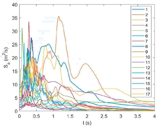 The strain hardening parameter αh is equal to 0.93 for the C– Mn steel pipe [], and the girth weld factor (αgw) is equal to 1 with D/t = 20. For the pipe studied herein with parameters represented in Table 1, εc is equal to 0.06.1 mm/mm. The resistance strain factor γε for three different classes, low, medium, and high, are equal to 2.0, 2.5, and 3.3, respectively []. The design compressive strain εSd for different classes are represented in Table 3. The strain at failure (local buckling of the compressive side) from the FE analysis [] is also given in Table 3. Fragility curves were applied in order to consider a probabilistic-based methodology that may consider the mutual interaction between soil deformability and the behaviour of HP/HT unburied subsea pipelines. In this regard, ref. [] proposed a methodology for the derivation of fragility curves for existing structures. In the present paper, fragility curves were developed by considering predefined limit states (LS) of the maximum strains (Table 3) at which the probability of exceedance was calculated. The seismic scenario consisted of 17 input motions with different intensity measures (IMs) in order to assess a wide range of damage in the pipeline (more details in []). Figure 4 shows the spectra of the selected 17 input motions and the corresponding peak ground accelerations (PGAs), while the characteristics of the inputs are shown in Table 4. The compression at the crown of the pipeline was considered as the reference parameter to express the damage condition.