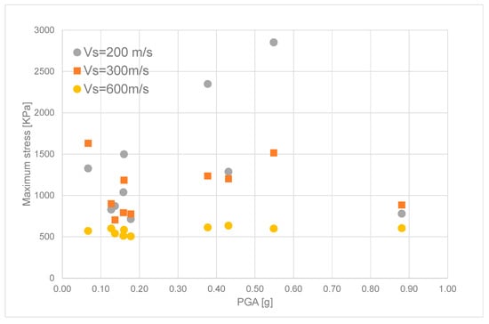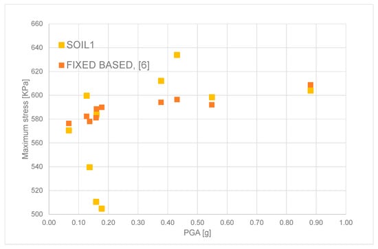 The first step was to validate the numerical model by comparing the fixed-based results calculated in the previous paper [] with those obtained herein for SOIL1 in terms of PGA and maximum stress. This comparison shows that both models have the same response under rigid soil conditions (Figure 5), demonstrating a good agreement and thus validating the model assumptions. Then, the response of the rigid soil (with no SSI) that resulted for SOIL2 and SOIL3 was compared (Figure 6), and linear regressions were applied to calculate the mean and the log-standard deviation (Table 5, Table 6 and Table 7) of the results of the performed non-linear dynamic analyses (for each soil conditions). It is worth noting that deformable soils (SOIL2 and SOIL3) show smaller mean values than those for SOIL1, underlining the effect of soil deformability in reducing the stresses inside the pipeline and thus reducing the global vulnerability. It is the consequence of the deformability of the soil that behaves as a natural isolator for the pipeline.
