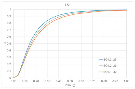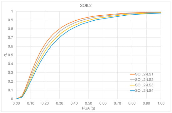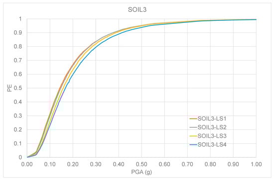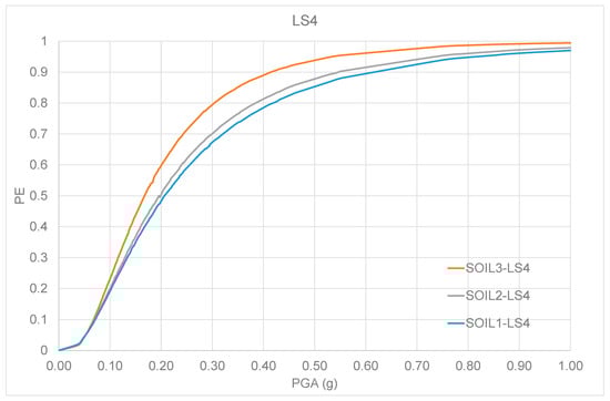Figure 9 and Figure 10 compare the considered soil conditions for LS1 and LS4, respectively. For example, at 0.30 g (Table 8), PE values for LS1 are 0.77, 0.80, and 0.84, while for LS4, PE values are 0.68, 0.70, and 0.79, respectively, for SOIL1, SOIL2, and SOIL3. In particular, Figure 10 and Figure 11 show that the pipeline vulnerability increases with soil deformability, since at every damage state, the PE for SOIL1 is smaller than those calculated for SOIL2 and SOIL3 for all PGA values. It is worth noting the difference in the probability reached at LS4 for SOIL2 and SOIL3. This difference is relatively small for PGA < 0.20 g and PGA > 0.30 g, while it increases gradually between 0.20 g and 0.30 g. At 0.24 g, the PE values are 0.60 and 0.70 for SOIL2 and SOIL3, respectively. The difference between the two soil conditions decreases for higher intensities and, for example, at 0.70 g, PE values are 0.97 and 0.94. This is due to non-linear deformations in the soils that become significant after a certain level is reached. In particular, the non-linear behaviour of the soil is driven by the ultimate strength of the soil (defined by the backbone curves, Figure 2) that needs a certain level of intensity to be mobilised. For SOIL3, the final shear strength (38 kPa, Figure 2) may be reached for intensity levels that are lower than those for SOIL2 (59.8 kPa, Figure 2). Therefore, the relative damage of the two soil conditions differs mainly at a moderate level of PGA because such intensities may affect the soil in different ways. At a higher level of PGA, the soil mobilises plastic behaviour, and the performance of the soil–pipeline system is similar. Figure 8 and Figure 11 show that the system becomes more fragile due to the damage due to soil deformability. This increased vulnerability is evident for LS4, where SOIL3 shows larger values of PE, demonstrating that SSI effects are detrimental. In particular, the effects of soil damping are significantly important, as shown in [].