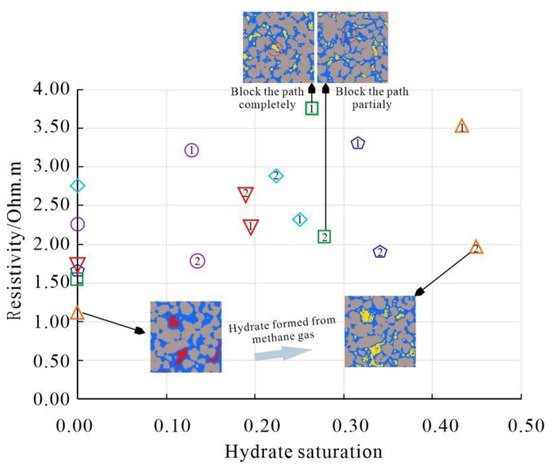 Zhao, J.; Liu, C.; Li, C.; Zhang, Y.; Bu, Q.; Wu, N.; Liu, Y.; Chen, Q. Pore-Scale Investigation of the Electrical Property and Saturation Exponent of Archie’s Law in Hydrate-Bearing Sediments. J. Mar. Sci. Eng. 2022, 10, 111. https://doi.org/10.3390/jmse10010111