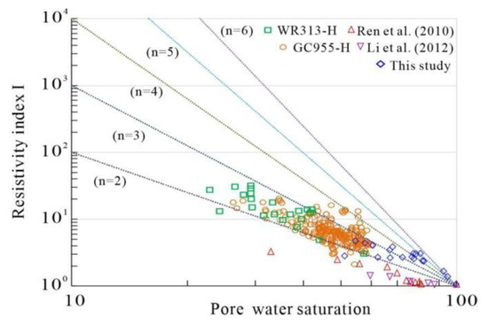 - Chen, Y.F.; Li, D.L.; Liang, D.Q.; Zhou, X.B.; Wu, N.Y. Relationship between gas hydrate saturation and resistivity in sediments of the South China Sea. Acta Pet. Sin. 2013, 34, 507–512. [Google Scholar]