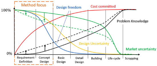 Generally, modularity is oriented to achieve different missions by the fundamentally same vessel (different equipment, superstructure, etc.). Here, the modularity is used to obtain vessels with different power system costs, emission performance, acoustic performance, etc., for the selected speed and capacity/number of passengers. As a novelty, the modular concept considered in this paper includes three virtual modules, i.e., ship hull, power system module and superstructure module, which are established based on the technical characteristics of existing passenger vessels operating in the Mediterranean Sea and future market needs in terms of environmental friendliness and comfort. It particularly targets the conceptual design stage, Figure 1, where design freedom is average, with relatively low knowledge about the problem and rather high market uncertainty. By interchanging the above modules, the ship’s basic mission remains the same, but the project can be quickly moved to another emission or comfort category which has a direct effect on the total costs.