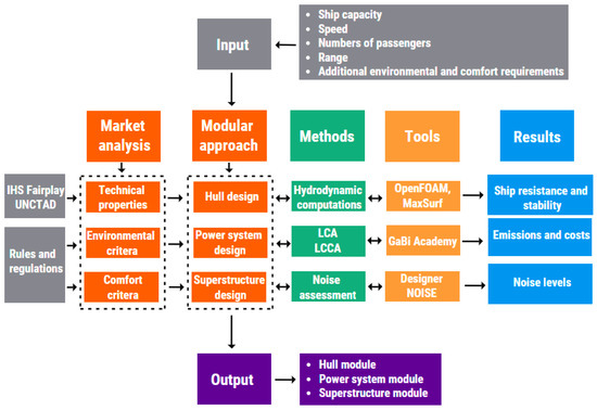 The developed methodology is schematically presented in Figure 2. The basic step includes an analysis of market needs and technical characteristics of existing vessels. Based on the design task that prescribes ship capacity, speed, range, and that might include additional requirements in terms of comfort or environmental friendliness, preliminary ship hull dimensions are determined and submitted to the preliminary resistance calculations and power needs prediction, by simplified methods. Within this investigation, the NavCad software is used, [18], but any other tool providing a quick estimation of the above quantities can be used. Comparative analysis of power needs with the power needs of similar ships available in the database is performed [19], and after the acceptable agreement is confirmed, a series of computations by computational fluid dynamics (CFD) tools are performed to obtain more reliable values. Depending on the power needs and allowable emissions, the most cost-effective power system module is selected. Similarly, depending on the target comfort level appropriate insulation of superstructure module is selected from a set of previously examined options.