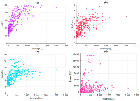 (a) Deadweight vs. Length overall, (b) Deadweight vs. Draft, (c) Deadweight vs. Beam, (d) Deadweight vs. Power.