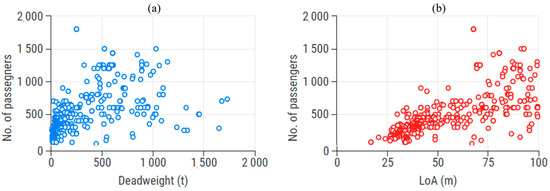 (a) Deadweight vs. Number of passengers, (b) Length overall vs. Number of passengers.