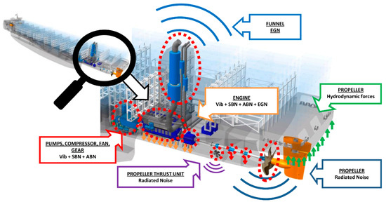 Noise and vibration problems are inherent to all ships due to the number of engines and devices needed for their operation. The main noise sources are in ships are the following: main engine and generator sets, gearboxes, propellers, exhaust systems with engine room ventilation, auxiliary mechanisms, such as hydraulic systems, pumps, ventilation and air-conditioning systems, side thrusters, etc., Figure 8.