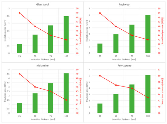 For noise assessment, the hybrid Statistical Energy Analysis (SEA) seems to be a reasonable choice, due to its simplicity and acceptable accuracy (particularly in the high frequency domain), [49]. Within the proposed approach passive noise reduction methods are applied, where mainly transmission paths are influenced, Figure 9. By means of the DesignerNOISE tool [50], series of passenger compartments, Figure 11, are investigated with different insulation materials and insulation thicknesses, where also the price is considered in order to provide guidance to the designer on the selection of the most appropriate one for the target comfort class, Figure 12.