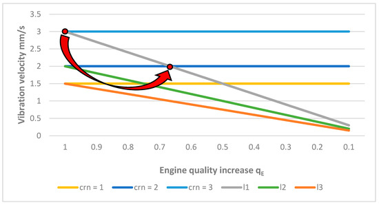 where location l represents vibration velocity that is required by classification societies, while e specifies maximum excitation force induced by the engine. By implementing different technologies on the source (engine), its quality can be changed in order to mitigate and control vibration transmission. This is denoted as engine quality qE, and this quantity is directly related to the costs. Regularly, the engine excitation e is known from the producer, quality of the engine qE is represented as a percentage decrease of vibratory response (from 0.1 to 1.0), and the location l is defined as vibration velocity, and all that has to be done is to calculate the ship’s transfer function S. It is necessary to investigate the transfer function S in combination with different engines and their excitations that eventually leads to the same vibration velocity at a certain location at the ship. An illustration of this approach can be seen in Figure 15. Different comfort classes are represented by the comfort rating number (crn), where level 1 (yellow curve) is a better solution in comparison with 2 (blue curve) which represents the lowest comfort level. As can be noticed in Figure 15, if one wants to shift from crn = 3 to crn = 2 or 1, the engine quality should increase, which necessarily leads to additional costs.