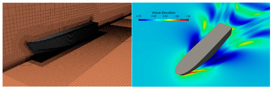 Computational mesh and free surface at ship design speed (V = 14 kn).