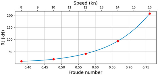 Hydrodynamic results for resistance are computed in CFD for various ship speeds. An example of the simulation and computational mesh is shown in Figure 16. Results for the resistance curve are shown in Figure 17. Following the estimation method for the engine power explained in Section 3.2. the design speed power requirements can be calculated using the towing resistance force. The engine requirement for this hull design is equal to 840 kW. In order to take into account auxiliary power needs, the main ship power needs are increased by 25%.