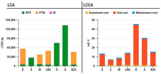 The LCA and LCCA results of the investigated ship are presented in Figure 19 where D denotes diesel, E denotes electricity, M refers to methanol, H refers to hydrogen used in a Proton Exchange Membrane Fuel Cell (PEMFC), A refers to ammonia used in PEMFC, while BD refers to the biodiesel-diesel blend B20.