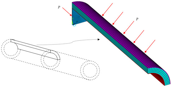 In the previous calculation, the specimens are under loads of both axial compression and external pressure. The purpose is to compare with the results from the experiment. After the validation, in parametrical study cases, the load is set to be only the uniform external pressure. The length of SPs is 1200 mm, half of the length and one-quarter of the cross-section is modelled. The physical property of the core layer is the same as shown in Figure 1a. The physical property of the metal pipe is selected as the same as that of the outer pipe in Figure 1b.