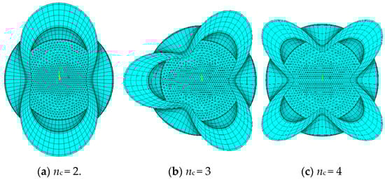 Different types of ovality are compared to each other. For the overall ovality, the value of nc is selected to be 2, 3, and 4. In this section, half of the whole circle is modelled in each case instead of one quarter in the previous because of the case Nc3. The cross-sections of three patterns are shown in Figure 4, with a scale factor of 100 for a clear illustration. The comparison result of the collapse pressure of the sandwich pipes is shown in Table 5.