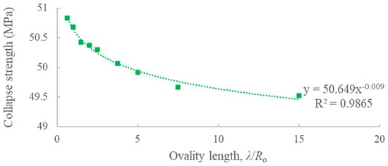 In Equation (3), the relationship between collapse strength and ovality length and ovality follows a power function. The influence of ratios of radius to thickness (R/t) of inner and outer pipe refers to Equation (2) in [18]. It is confirmed that the influence of the R/t of the inner pipe is greater than that of the outer pipe.