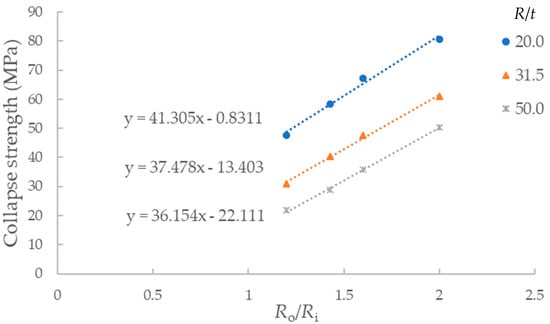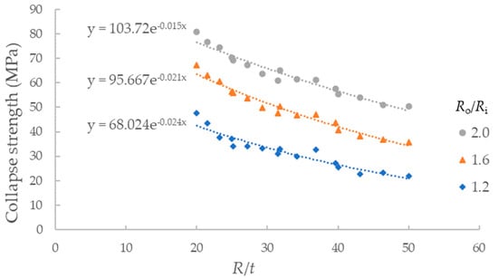 The relationship between collapse strength of imperfect SPs and R/t is shown in Figure 8, and the relationship between collapse strength and Ro/Ri is shown in Figure 9. In both figures, the ovality is the same with the parameter λ/Ro = 2.0 and Δ = 0.2%. It is clear that the collapse strength is greater of SPs with a higher value of Ro/Ri or a lower value of R/t. The changing rates of the curves are almost the same in both figures. However, it is concluded from the expression of C in Equation (3) that the influence of R/t is greater than that of Ro/Ri by checking the partial derivatives of both parameters. Due to the material strength of the metal pipe that is much higher than that of the core layer, the improvement of strength of both outer and inner pipes results in significant promotion of the collapse strength of SPs. Thus, in order to obtain SPs with a higher carrying capacity of external pressure, it is recommended to increase the strength of metal pipes, especially the inner pipe.