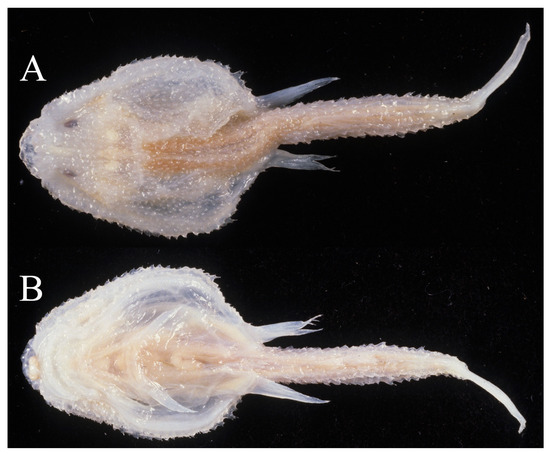 Halieutopsis andriashevi Bradbury, 1988, holotype, SIO 61-14-65A, 46.2 mm SL, Indian Ocean. (A). Dorsal view. (B). Ventral view. Photos by M. G. Bradbury.