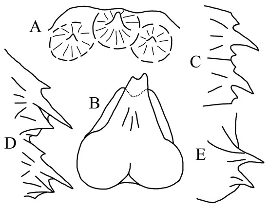 Esca and squamation of H. taiwanea sp. nov., from holotype. (A). Rostrum. (B). Esca. (C). Tubercles on disk margin. (D). Tubercle on tail. (E). Subopercular tubercle.