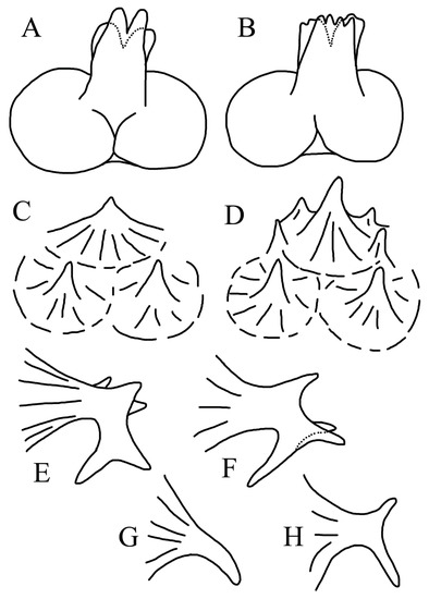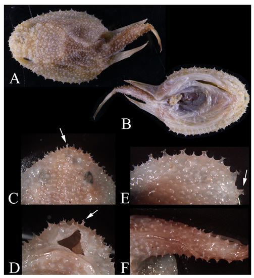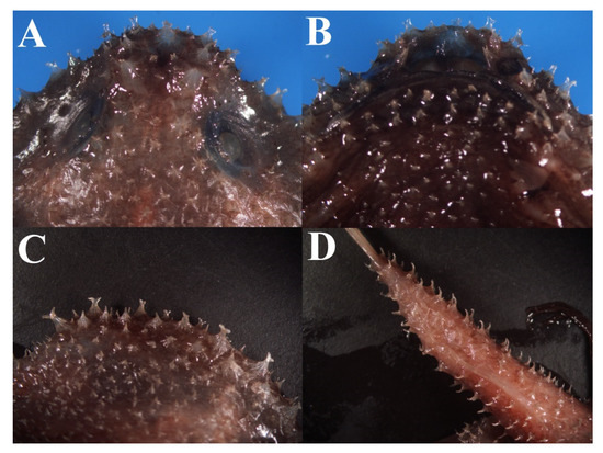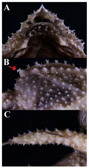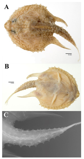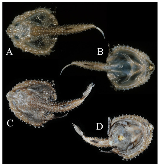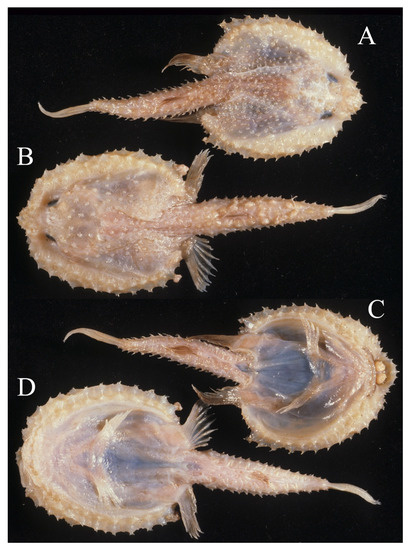 - Shimazaki, M.; Endo, H.; Yabe, M. Redescription of a Rare Deep-Sea Batfish, Halieutopsis bathyoreos (Lophiiformes: Ogcocephalidae). Ichthy. Res. 2004, 51, 120–125. [Google Scholar] [CrossRef]