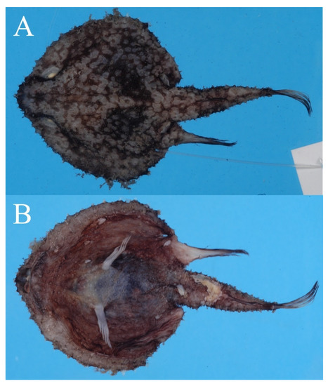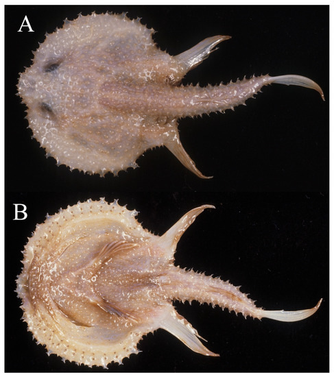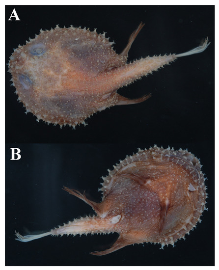 - Okamura, O.; Machida, Y.; Mochizuki, K.; Yamakawa, T. First Record of the Deep-Sea Batfish Halieutopsis stellifera from Japan. Rep. USA March Biol. Ins. Kochi Univ. 1987, 9, 201–205. [Google Scholar]