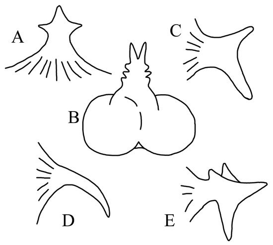 - Bradbury, M.G. A Review of the Fish Genus Dibranchus with Descriptions of New Species and a New Genus Solocisquama (Lophiiformes, Ogcocephalidae). Proc. Calif. Acad. Sci. 1999, 51, 259–310. [Google Scholar]