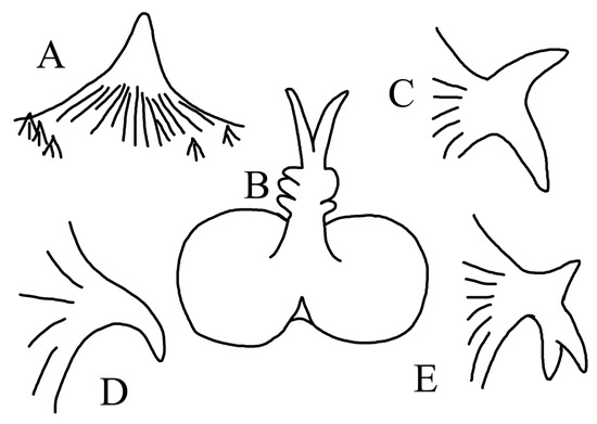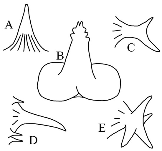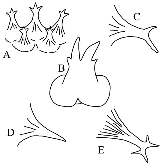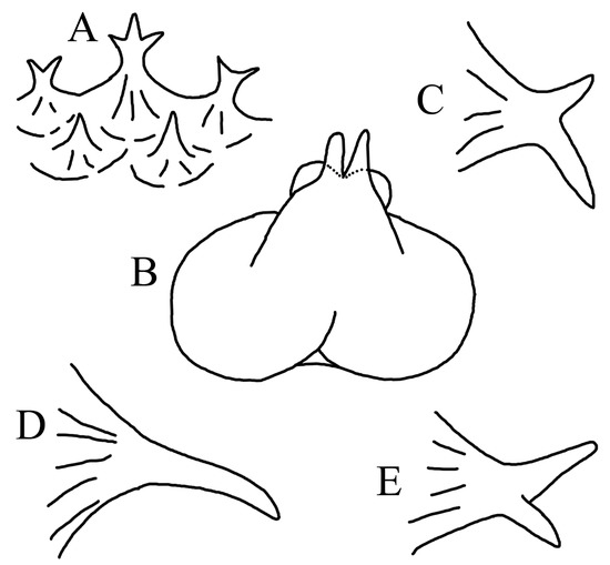 Esca and squamation of H. andriashevi Bradbury, 1988, from BSKU 23697, 51.0 mm SL. (A). Rostral tubercles. (B). Esca. (C). Tubercles on disk margin. (D). Tubercles on tail. (E). Subopercular tubercle.