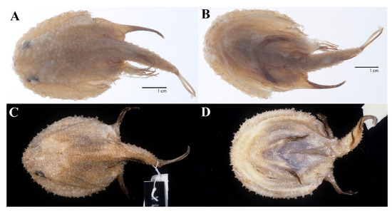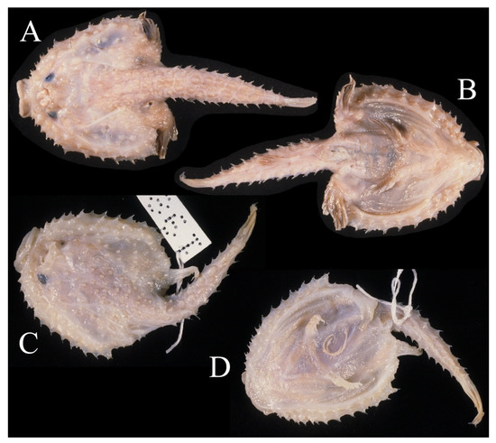 Halieutopsis stellifera (Smith and Radcliffe, 1912). (A,B). Holotype, USNM 70273, 67.9 mm SL, photos by S. Raredon, courtesy of USNM. (C,D). BSKU 29775, 64.6 mm SL, photos by M. G. Bradbury. (A,C). Dorsal view. (B,D). Ventral view.