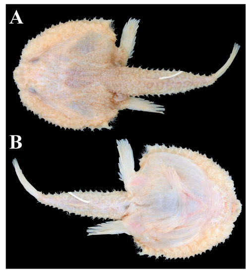 Description. Morphometric and meristic data as given in Table 1, Table 2 and Table 5. Body disk depressed, with skull slightly elevated above surface of disk. Disk sub-triangular, with length subequal to width and anterior margin somewhat truncate (Figure 36). Disk relatively short and narrow as reflected in proportions of skull length, head depth, head width, disk margin, predorsal and preanal lengths.