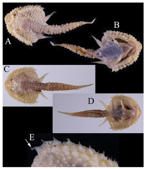 Principal tubercles on dorsal surface of moderate size with 10–16 facets (mostly 13–14); those on disk margin slightly flattened with bases closely adjoining each other to form serrate margin, all spines simple-tipped (Figure 37C); tubercles absent from ventral surface including pelvic-fin base; that on subopercle curving slightly inwards (Figure 36E), divided into two short, upwardly directed spinelets at its base (Figure 37E), with one additional small, upwardly directed spinelet present in ASIZP 66275. Tubercles on dorsal and ventral surfaces of tail simple with broad base; those associated with lateral-line scales on sides of tail simple, directed outwards and backward (Figure 37D).