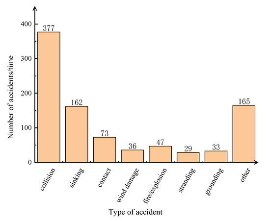 According to the “Statistical Measures for Maritime accidents of the People’s Republic of China” [16], maritime accidents are mainly divided into 10 categories: collision, stranding, rocking, contact, wave damage, fire/explosion, wind disaster, self-sinking, operational pollution, and a number of other maritime accidents that result in casualties, direct economic losses, or pollution of the water environment. According to this classification, the 922 maritime accidents assessed in this paper were classified as: 377 collisions, 162 sinking, 73 contact damage, 36 wind damage, 47 fires/explosions, 29 stranding events, 33 grounding events, and 165 events classified as “others”. Collision accidents are the most frequent maritime accidents, followed by sinking and contact damage with higher frequencies. Specific as shown in Figure 2.