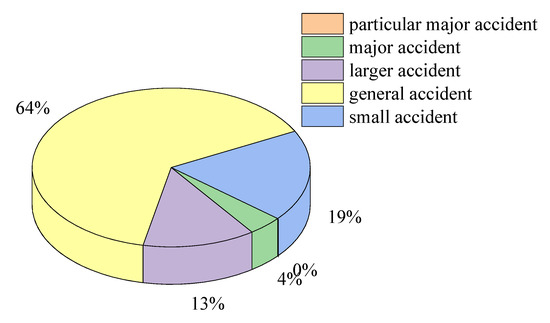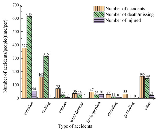 According to the “Statistical Measures for Maritime accidents of the People’s Republic of China”, maritime accidents are divided into five levels according to their severity: particular major accidents, major accidents, larger accidents, general accidents, and small accidents. Among the 922 accidents analyzed in this paper, zero were particular major accidents, 37 were major accidents, 121 were larger accidents, 592 were general accidents, and 172 were small accidents. Specific as shown in Figure 3. This shows that overall, the vast majority of maritime accidents in China are accidents of general grade and below, which together, account for 82% of the total number of accidents. Accidents of the general grade account for the largest proportion, reaching 64.2%. In addition, in terms of the number of dead, missing, and injured as a result of different types of accidents, as shown in Figure 4, collision accidents caused the most casualties, followed by sinking accidents.