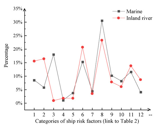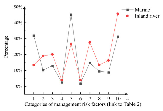 Through the statistics of the number of risk factors and sub-factors as described by accident reports, the proportion of the number of risk factors and sub-factors is obtained. The frequency of risk sub-factors in inland river and marine accidents is compared and analyzed and the results are depicted in Figure 6, Figure 7, Figure 8 and Figure 9.