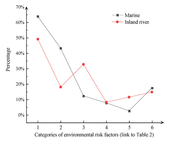 As shown in Figure 8, the environmental sub-factors basically follow the same trend of activity for both the causes of marine and inland river accidents except for the flow factor. Among them, the wind factor accounts for the largest proportion, with a combined proportion of about 55%. In maritime accidents, environmental factors such as wind and waves account for a larger proportion, while in inland rivers, wind and flow factors account for a larger proportion. The flow factor is more prominent in inland river accidents (i.e., second place), but less prominent (i.e., fourth place) in maritime accidents. The influence of the rain factor on the inland river accidents is also slightly higher than that out at sea. The complex flow patterns in inland rivers, which are prone to bends and bridge areas, exert a stronger impact on inland river accidents. Open sea areas are prone to strong winds and large waves that exert a greater impact on maritime accidents.