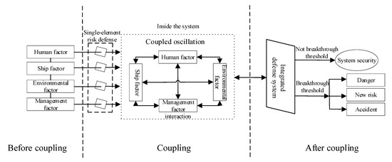 By applying the trigger principle, the evolution process of maritime accidents is shown in Figure 10. In the process of the transmission of risk factors within the system, after breaking through the sub-defense system, new pulses will be generated after application of the coupling filter. These new pulses will undergo coupling oscillations to increase the risk flow. (Coupling oscillation refers to the interaction of different risk factors within the system.) When the risk breaks through the integrated defense system, maritime accidents will occur; alternatively, their risk of occurrence will increase or new risks may be generated, which will then lead to the occurrence of maritime accidents.
