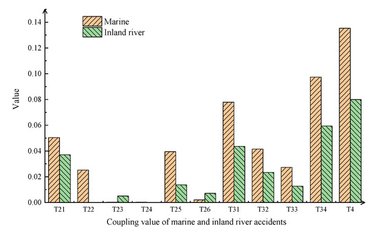 Among the risk coupling values of inland river accidents, the coupling value T4 of the four-factor coupling of human-ship-environmental-management is highest, and the probability that all four factors simultaneously participate in the coupling is also highest. In the three-factor coupling, T34 > T31 > T32 > T33, the probability that objective factors such as ship factors and environmental factors simultaneously participate in coupling accidents is higher than the probability that subjective factors (i.e., human factors and management factors) simultaneously participate in coupling accidents. In the two-factor coupling, T21 > T25 > T26 > T23 > T24 > T22, the coupling value of the two coupling modes of man-ship and ship-management is much higher than the values of other coupling modes. Therefore, accidents are more likely caused when ship factors and subjective factors (i.e., human factors or management factors) are coupled.