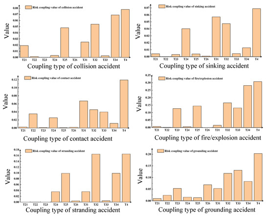 Different types of maritime accidents have different risk causes, and their risk coupling characteristics are also different. To analyze the risk coupling characteristics of different types of maritime accidents, 922 maritime accidents were collected and classified according to the following six types of maritime accidents: collision, contact, sinking, fire/explosion, stranding, and grounding. Using a similar method to that described in Section 4, the risk coupling values of various types of traffic accidents are calculated, and the results are shown in Figure 12.