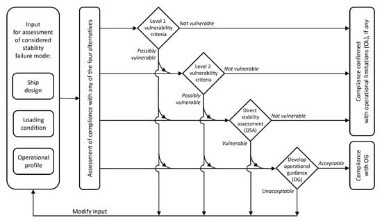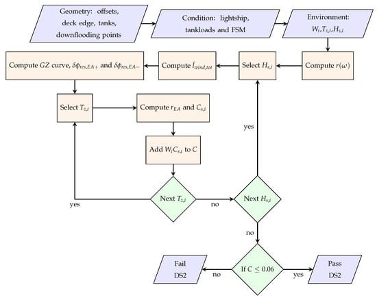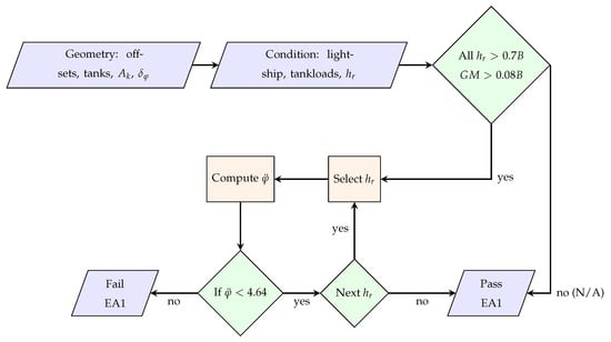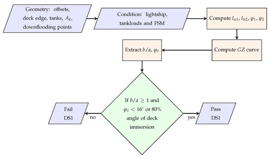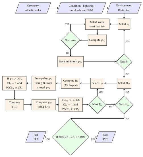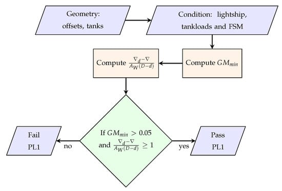 If  according to Equation (13) is greater than 0.05 m and the volume ratio from Equation (14) is greater than or equal to at least 1.0, the vessel is not considered vulnerable to pure loss of stability. All required information in Equations (13) and (14) are readily computed using standard hydrostatic solvers. A complete process diagram for an algorithmic implementation of PL level 1 is given by Figure 9.